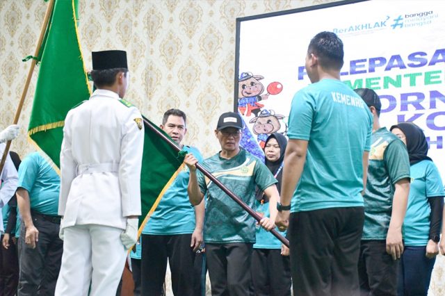 Acara pelepasan kontingen ditandai penyerahan bendera Kemenag dan bendera Korpri oleh Kakanwil kepada Ketua Kontingen dan ofisial.