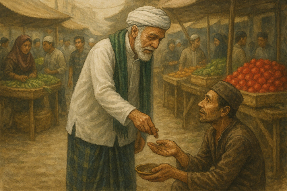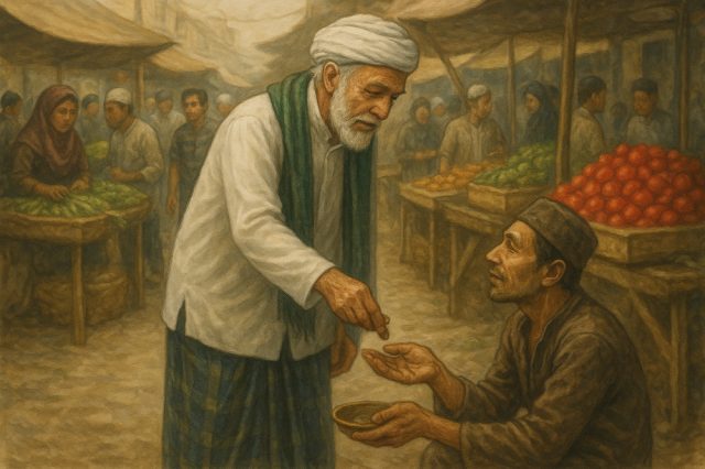 ILUSTRASI : Seorang ahli ibadah (60) di sebuah pasar, sedang memberi uang kepada fakir miskin. (Sumber : AI).